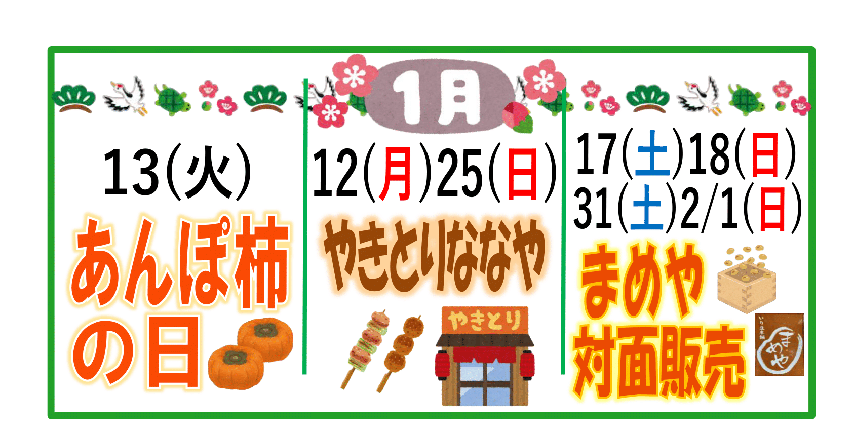 愛情館の営業は1/5(月)からとなります。今年も皆様に安心・安全・新鮮な青果物を販売させていただきます。1/5(月)と1/6(火)は甘麴ドリンクのふるまいを行います。皆様のご来店をお待ちしております。
