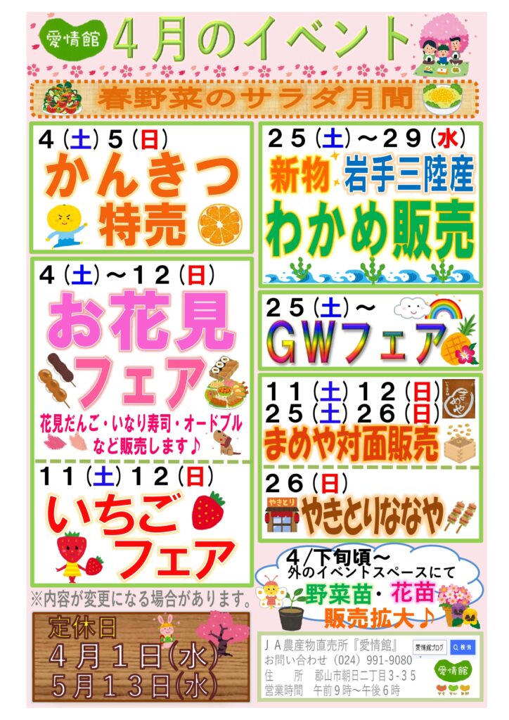 あっという間にお花見の季節になりました。愛情館では花見だんごやいなり寿司、オードブルなどを販売しています。それ以外の商品も通常通り取り揃えておりますので、お好きなものを買って、みなさんそれぞれのお花見を楽しんでください♪
