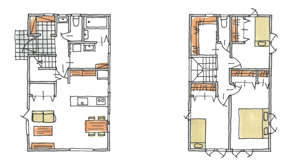 今回設計を担当したのは2児の母である渡伝組の専務 武藤さん。「こんな家だったら働く女性や、育児が大変なお母さんも快適に過ごせるんじゃないかと考えて設計しました。どちらの棟もキッチンからバスルームへの導線がスムーズ。A棟には大きめのパントリーがありますよ。B棟はリビングから天井が吹抜けになっており、開放感があります。A棟の2階の寝室には扉が2つあり、両サイドにクローゼットもあるので、子どもの成長にあわせて間仕切りをして部屋を分けることもできますよ」と設計のこだわりを話していただきました。