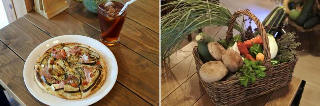 左)ずんない椎茸と生ハムのピザ 右)シェフや地元の農家さんが大切に育てた新鮮野菜たち