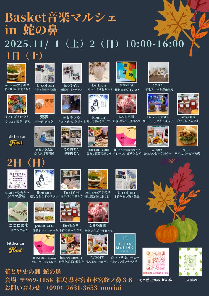 花と歴史の郷 蛇の鼻で初のマルシェ開催!ピクニック広場を中心に心地よい音楽ライブと、20店舗以上のバラエティ豊かなBasketマルシェが同時に楽しめます。ハンドメイド雑貨、ワークショップ、旬のフードやスイーツも満載。 紅葉狩りとマルシェをぜひご堪能ください。