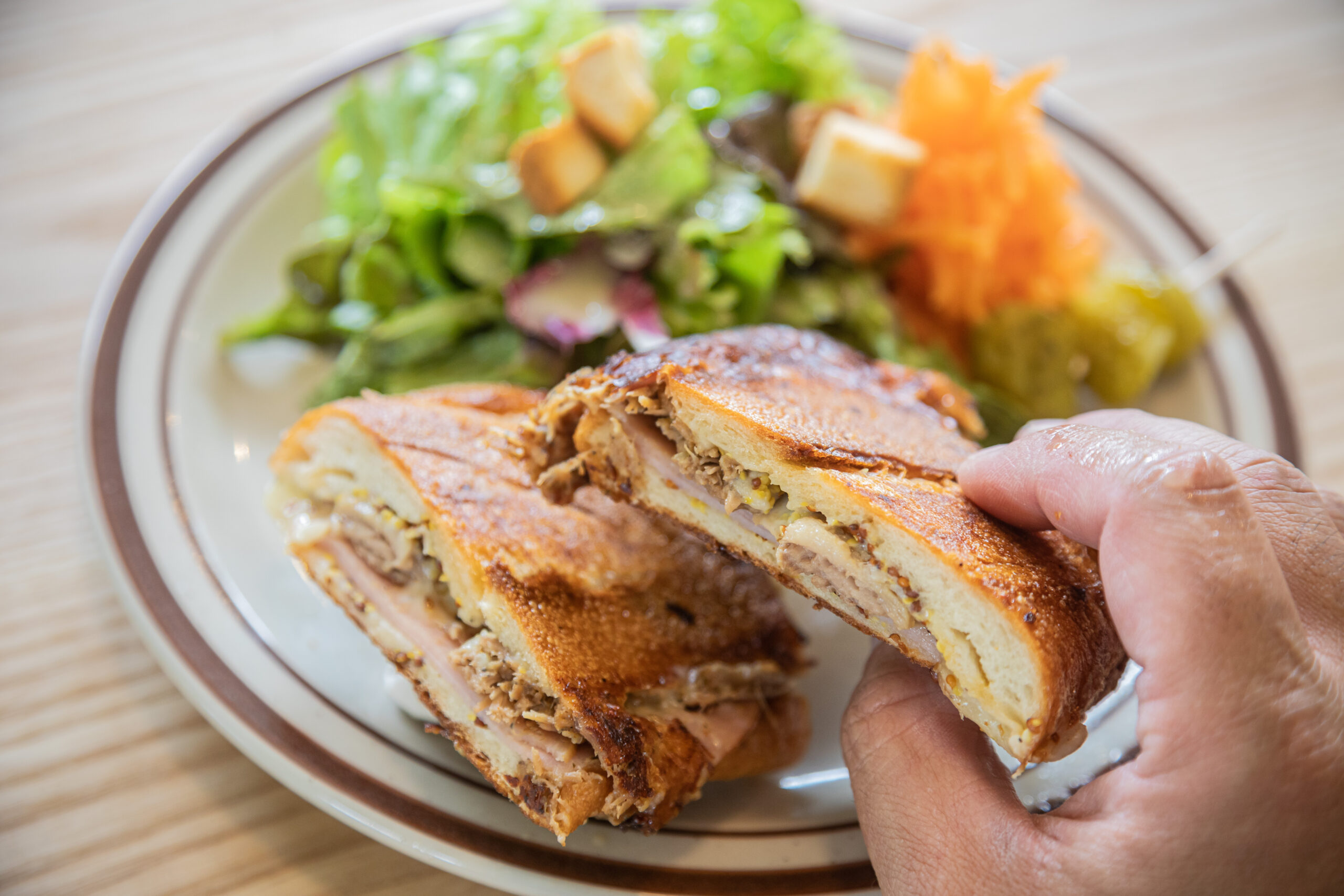 プレスしながらバターで焼き上げ、表面はザクザク!中はホロホロに煮込んだ豚肉、とろけるチーズと旨味凝縮で食べ応えのあるホットサンド。