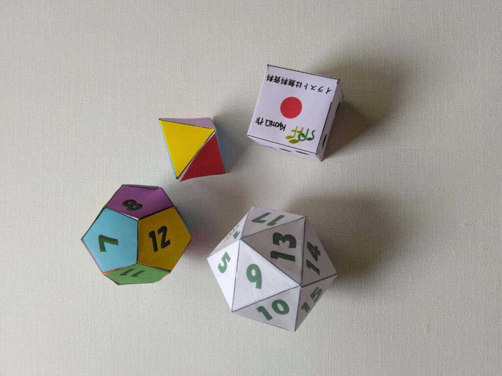 正六面体や正二十面体など、さまざまな形のサイコロを工作。色や模様を付けて自分だけの“マイサイコロ”が完成します。