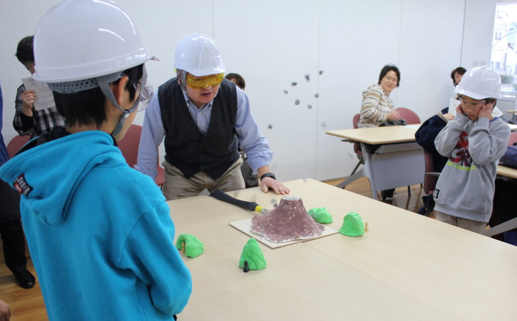 火山模型を使って、マグマや噴火のしくみを学びます。火山にまつわる民話の読み聞かせもセットになった特別プログラム。