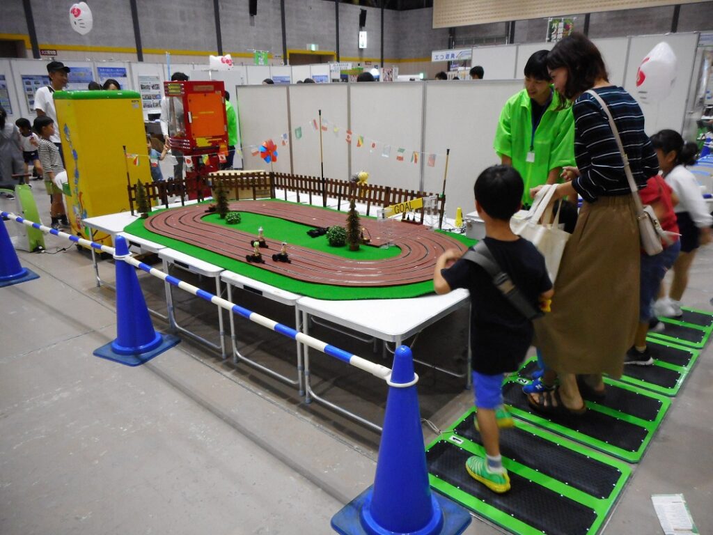 発電で作った電気でおもちゃの車を走らせます。みんなでレースをして競い合うのが面白い!