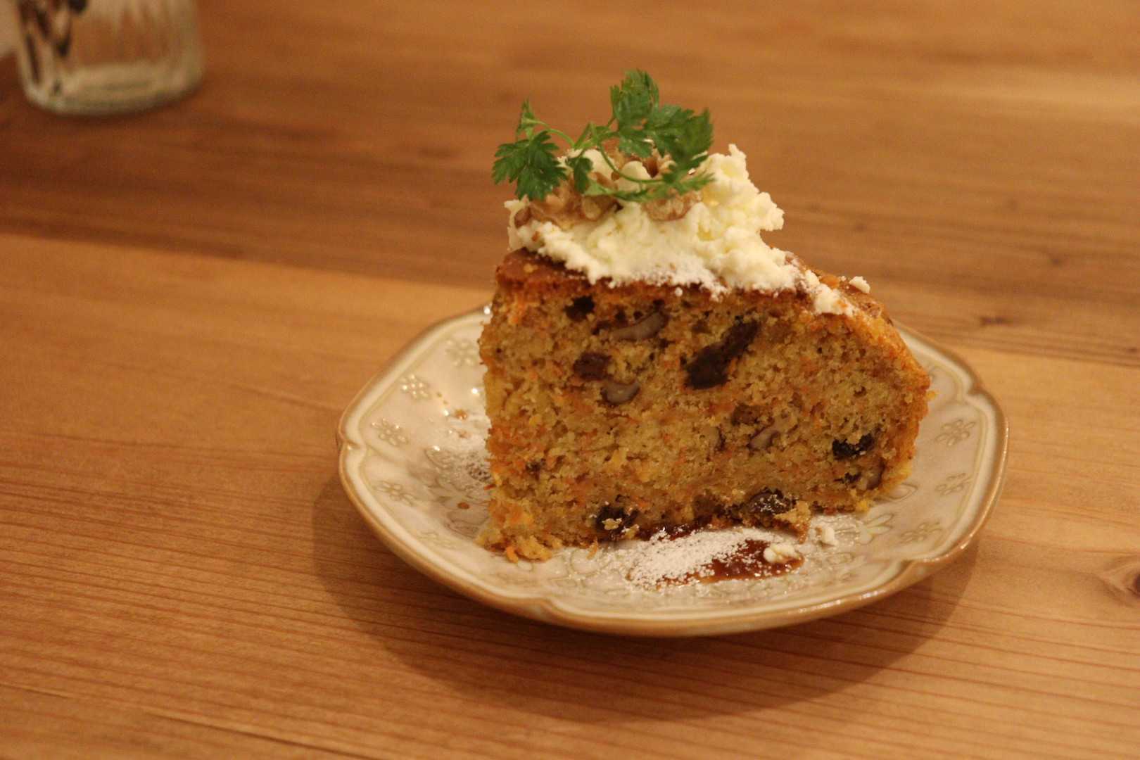 にんじんと、レーズンやクルミがたっぷり入った食べ応えのあるケーキ。チーズフロスティング、チャービルと合わせて食べるとまたおいしい!