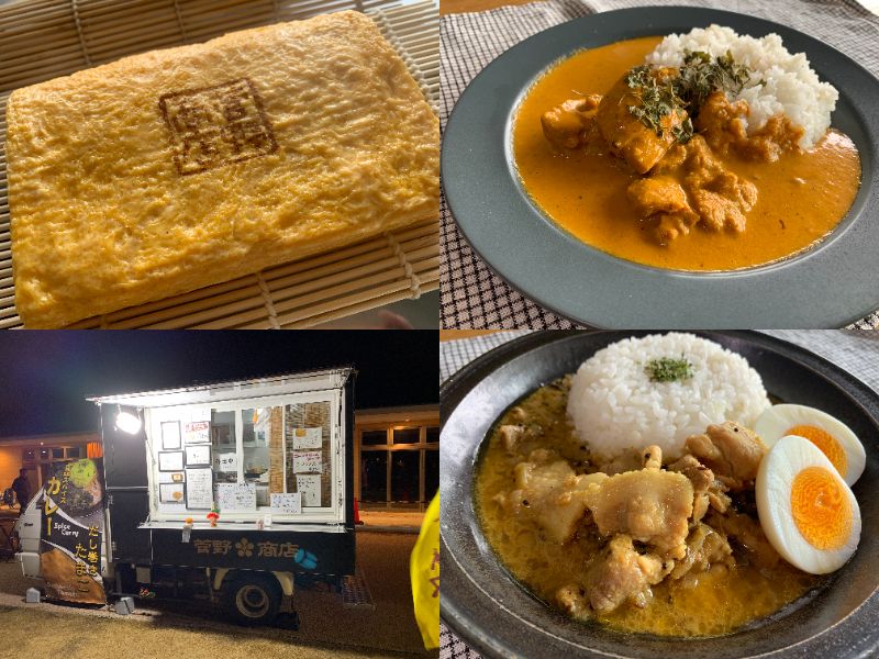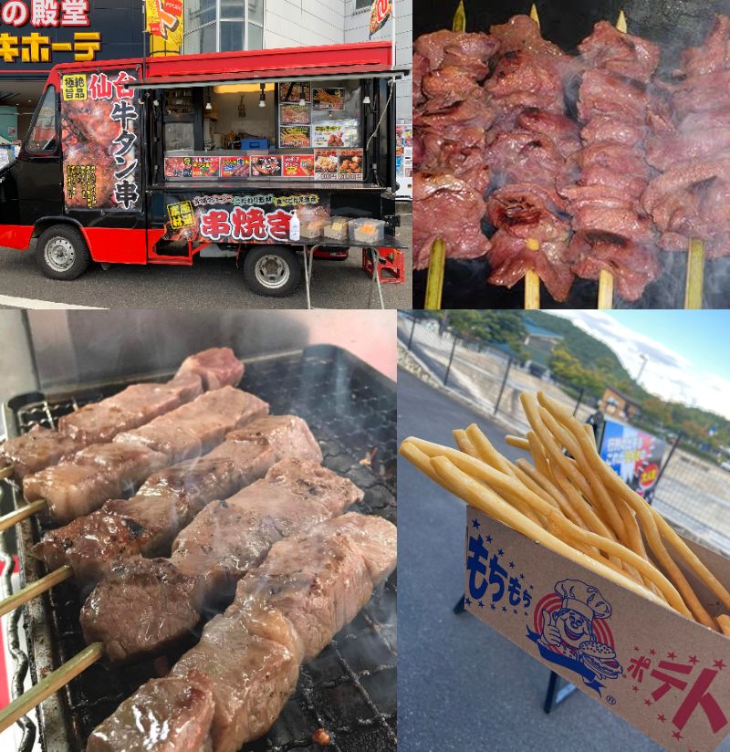 ◆メニュー/牛タン串焼き、もちもちポテト、肉巻きおにぎり串、さつまいもチップス、せり鍋又は山形芋煮、芋煮カレーうどん、チーズハッドグ、チュロス、タコ焼き、ドリンク