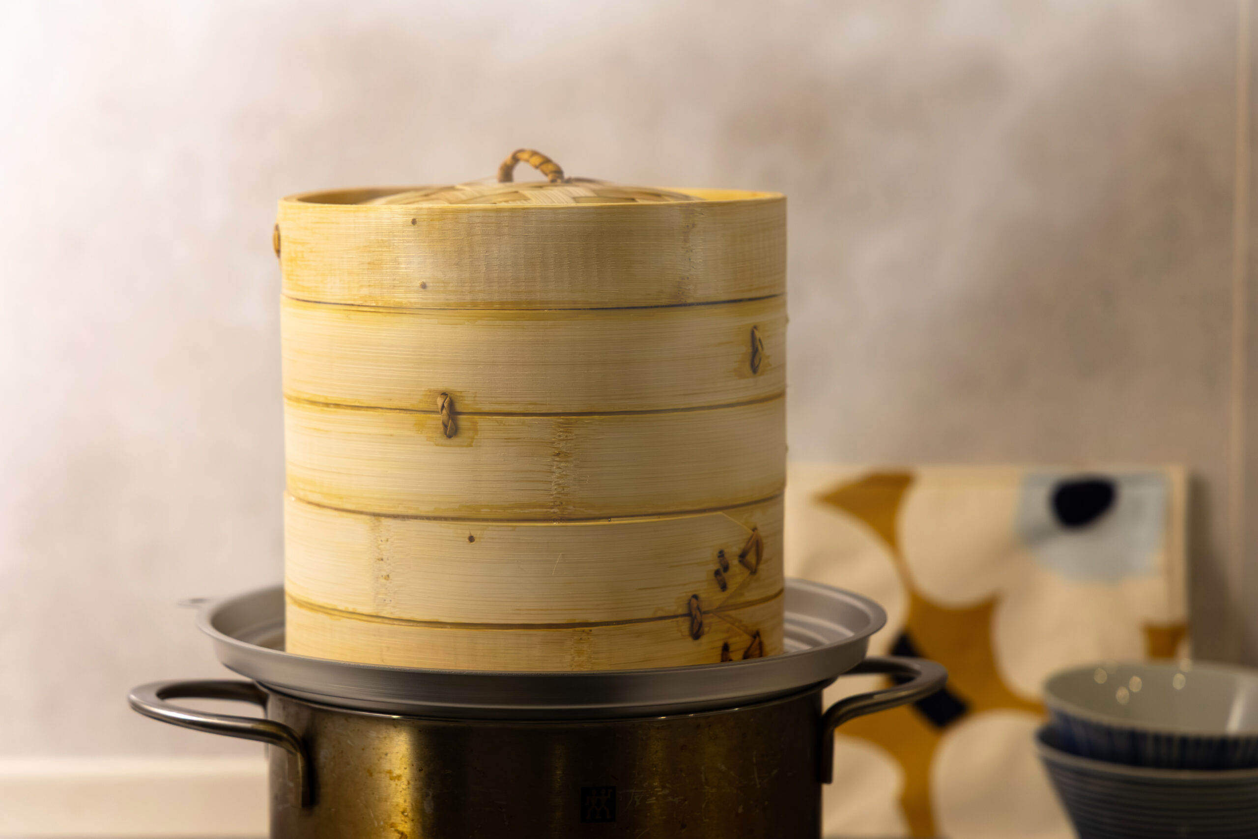 ③せいろを鍋から外し、蓋を開けて蒸気を逃す。