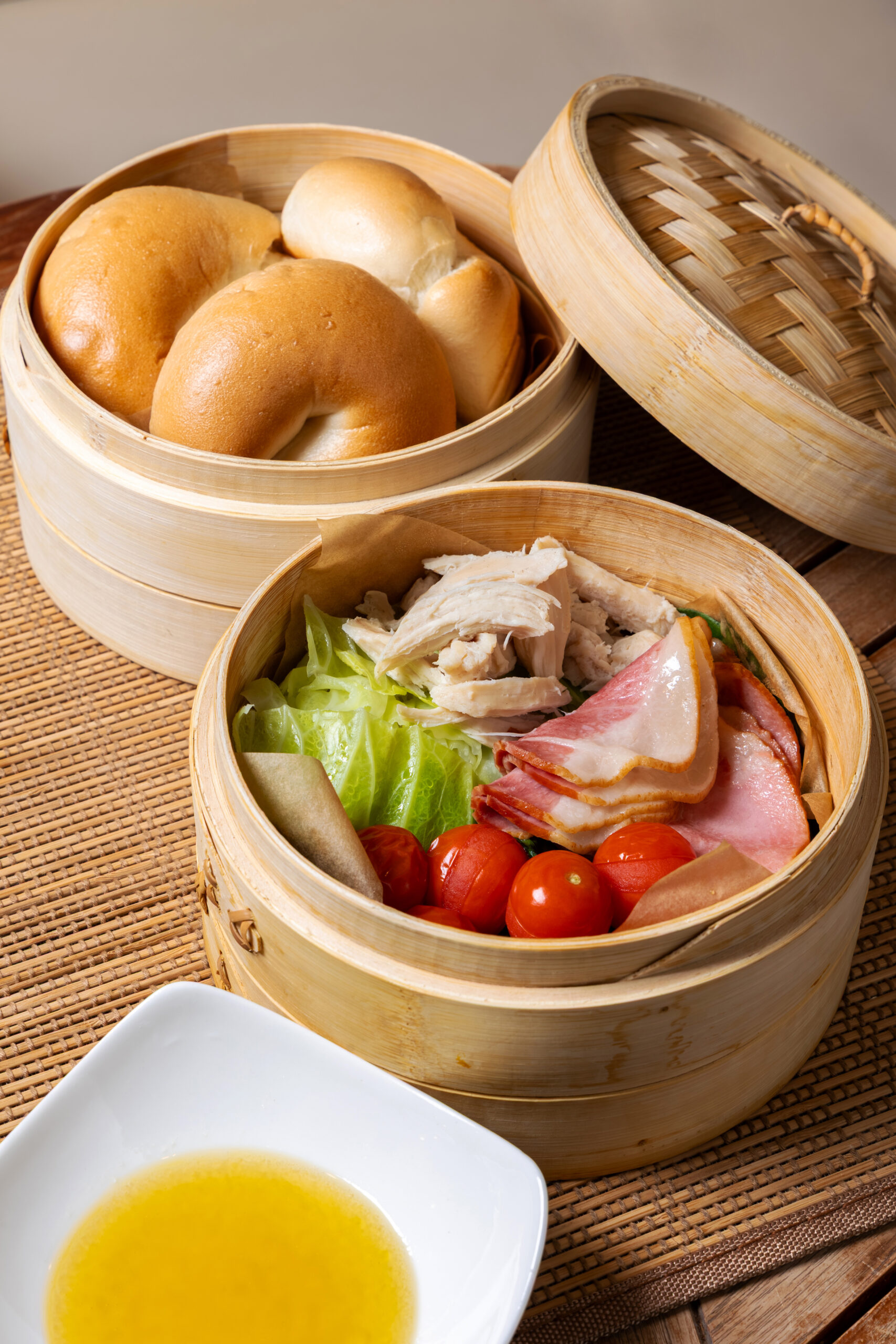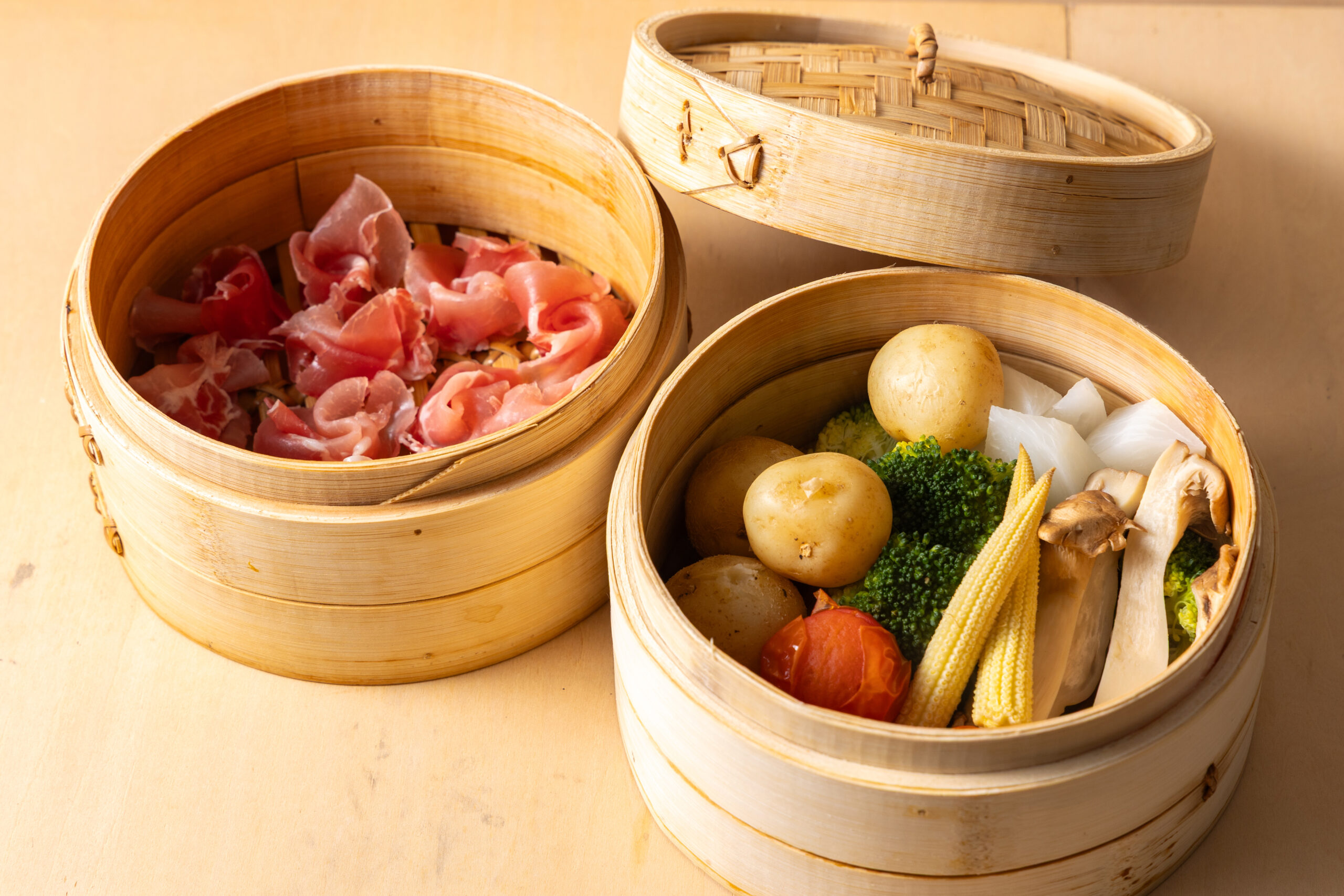 ④生ハムをもう一段せいろに、重ならないように並べる。