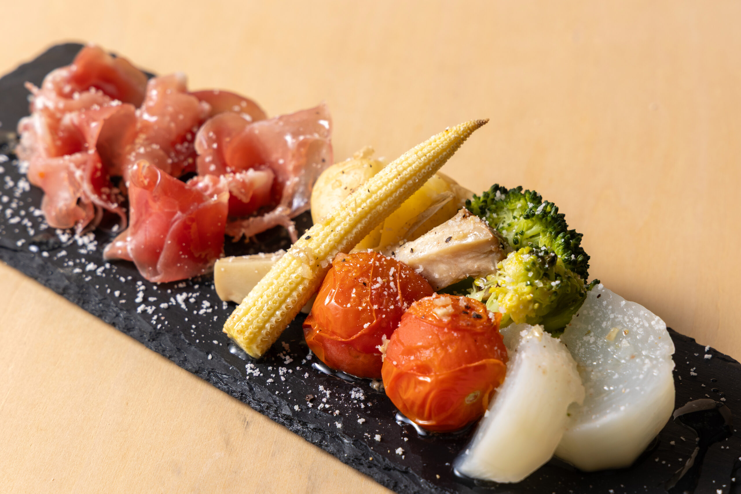 ⑥皿に野菜と生ハムを盛り付け、アンチョビガーリックオイルをかける。岩塩とブラックペッパーで味を整え、仕上げにパルミジャーノ・レッジャーノをすりおろす。
