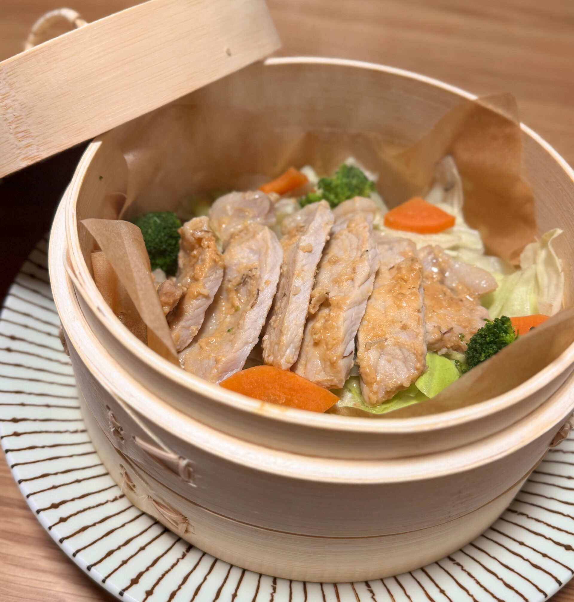 ③せいろに野菜を入れ、ベーコンとサラダチキンをのせて7分蒸す。
