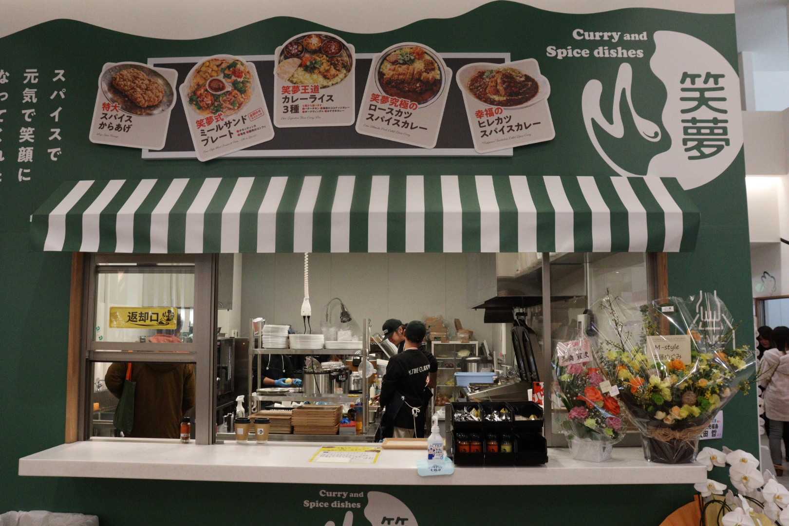 フードコート内でもよく目立つ深緑色の外観が目印。カトラリーやオリジナルスパイスなどは受取口で自由にチョイス可能。