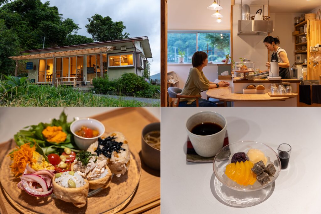 続いて訪れたのは、長らく空き家だった倉庫を改装して生まれた「Cafeしずく」。縁側から靴を脱いで上がるスタイルがどこか懐かしく、初めて訪れる人でも自然とくつろげる雰囲気です。カフェの誕生は、葛尾村にアーティストを呼び込む活動がきっかけだったそう。オーナーの大山さんもアーティストとして村に移住した一人で、店内にはアーティストの作品だけでなく、地元の子どもやおじいちゃんの絵や工作も飾られ、誰もが表現者になれる空間に。地元食材をふんだんに使った彩り豊かなランチプレートや、村の人直伝の凍みもち入りあんみつも絶品です。BGMはなく、耳に届くのは虫の声や水のせせらぎ。自然とアート、そして人の営みが一つにつながる、葛尾ならではの極上の田舎体験がここにあります。