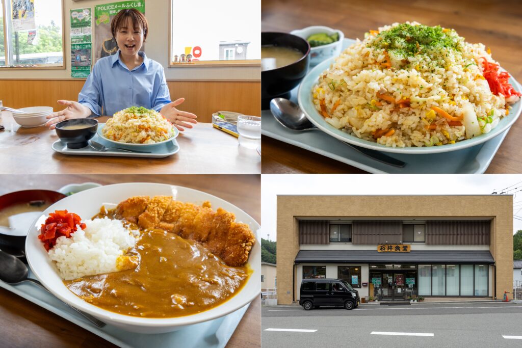 葛尾村の名物グルメといえば「石井食堂」。看板メニューはお米3合を使ったチャーハンで、具沢山なのに懐かしい味わい!食べきれなかった分はテイクアウトもOKで、このボリュームが950円というから驚きです。また、カツカレーも人気で、こちらも総重量1キロ超えのデカ盛りスタイル。ルーもたっぷりで満足感は抜群です。物価高中でも、お客様の声に応えて、年々量を増やしているというサービス精神に心まで満たされます。