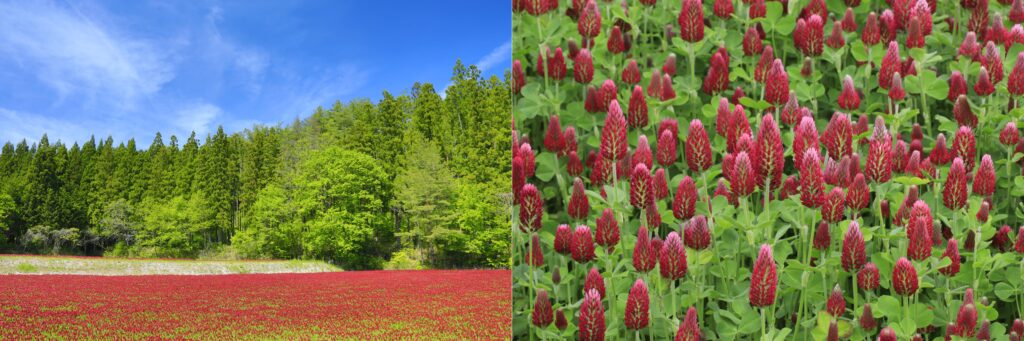 福島第一原発の放射能事故により荒れ果ててしまった圃場の再生に向け、葛尾村が着目したのがクリムゾンクローバー。2018年から作付けがスタートし、毎年少しずつ作付面積が広がっています。最近ではこうした取り組みがメディアで紹介され、SNSなどでも話題に♪鮮やかな赤い花が一面に広がる光景は、葛尾村の新たな春の風物詩です。