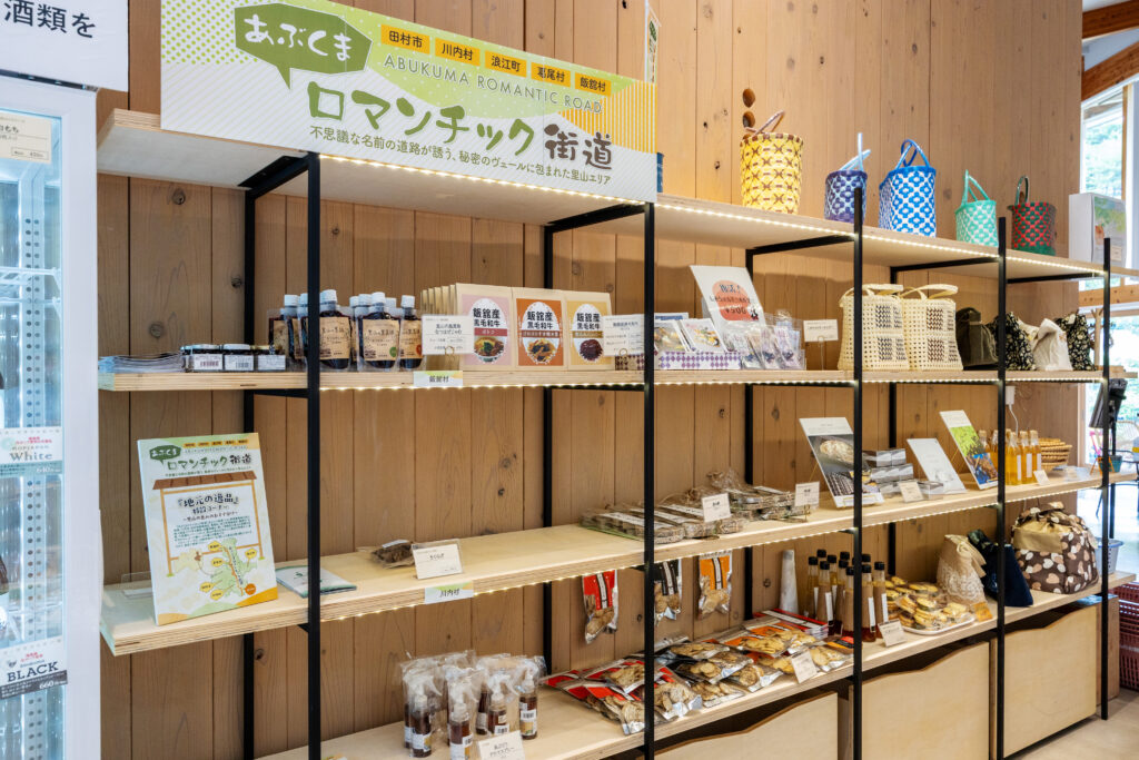 葛尾村の中心部にある「復興交流館 あぜりあ」は、観光案内や特産品販売を行う交流拠点。農産物や加工品、木工雑貨などの物販コーナーに加え、あぶロマ沿線市町村の特産品コーナーも設置され、花めぐりドライブの立ち寄り先としても重宝します。