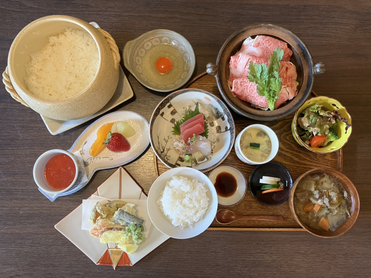 料理長が厳選した福島牛のすき焼きと、新鮮なお魚を使ったお造りが自慢のランチ。釜でじっくりと炊き上げたごはんが、お客様から好評です。季節の野菜を用いた天ぷらと、鰹節から出汁をとって作った茶碗蒸しもおすすめ。