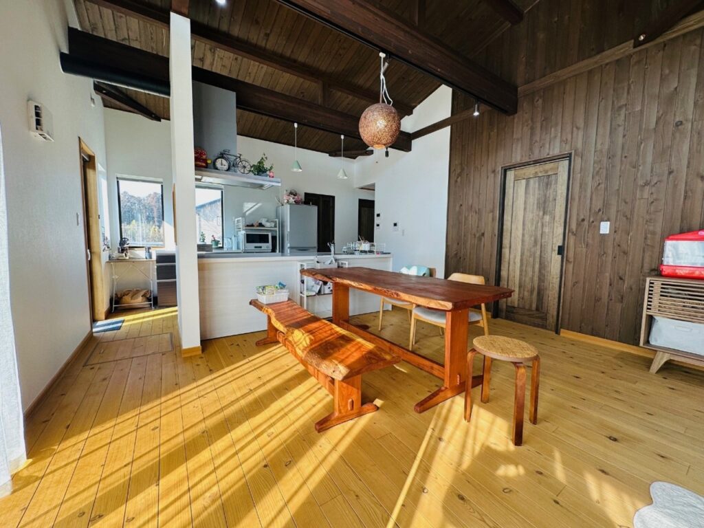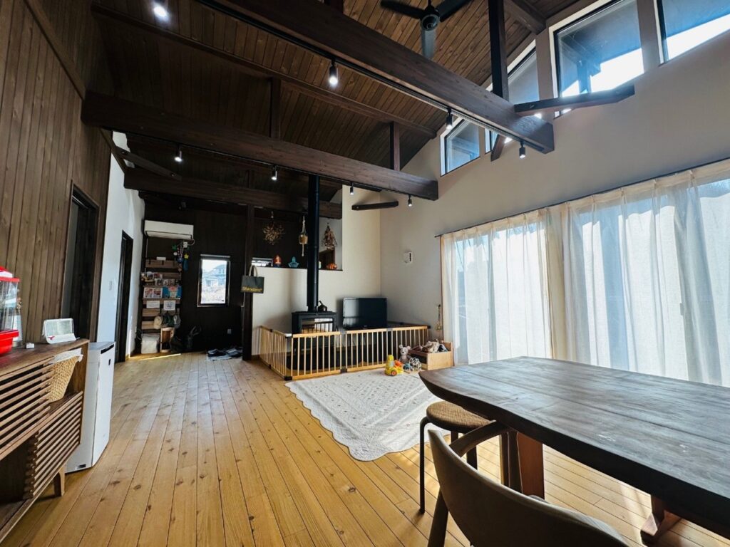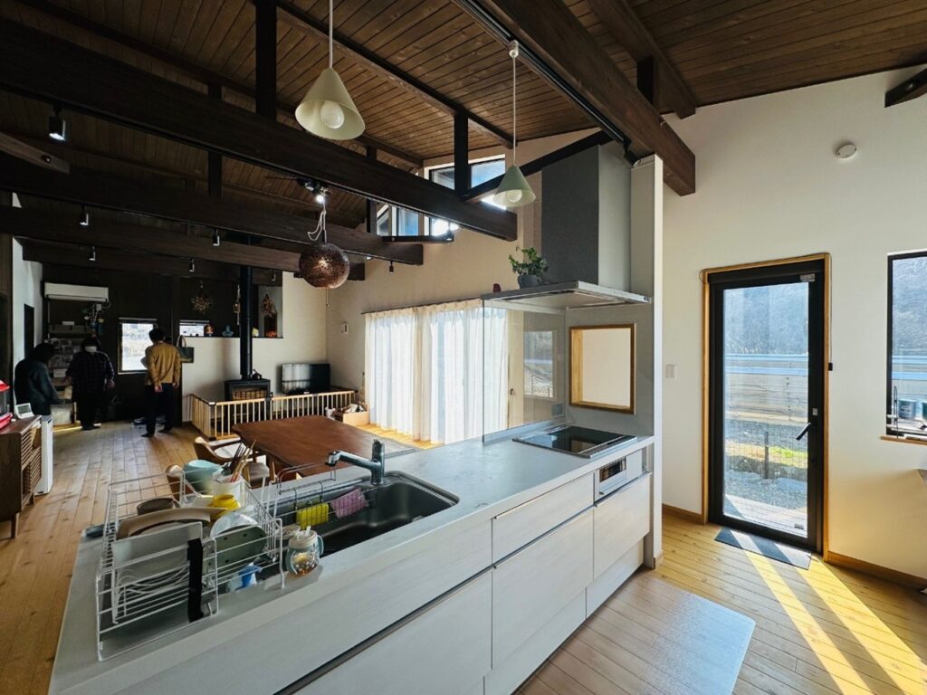 アイランドキッチンから見たリビング・ダイニング。現しの梁が開放感と木の温もりを演出した癒やしの大空間。薪ストーブの温もりも家族を優しく包み込みます。