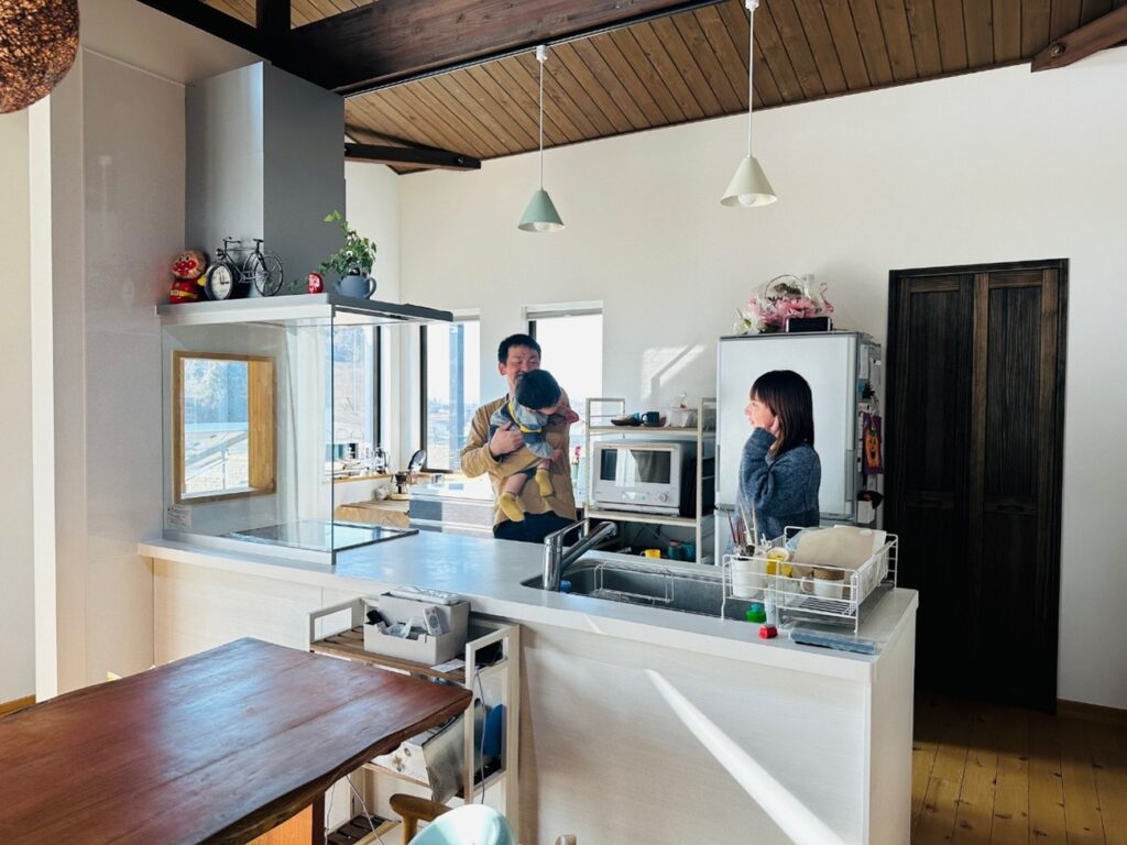 奥様 このキッチンに立って作業をしながら、薪ストーブの炎を見たり、子どもの遊んでいる様子が見えるのもいいですね。振り返ると、大きな窓から郡山市街が眺められるのも気持ちがいいです。高台の場所に建てて良かったといつも思います。
