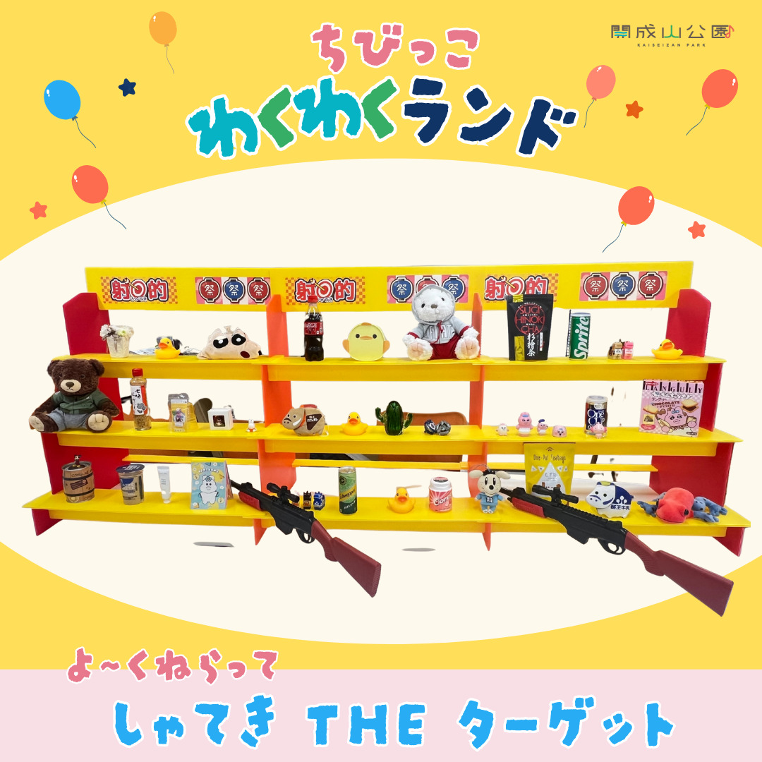 運命のシールくじ、アヒルさんすくい、ぐるぐるプカプカすくい、ガチャボール釣り、射的THEターゲット、ジャンボスライダーorふわふわUFOの5種類が遊べます♪
