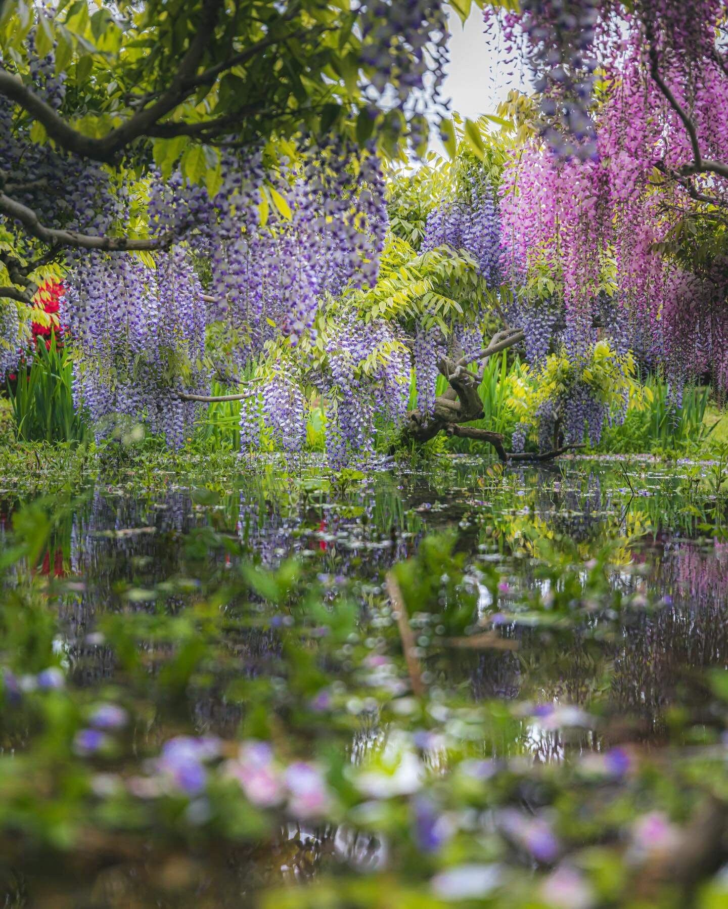 藤の花が水面に映り込み、上下に広がる世界観が美しい作品です。色彩のコントラストと自然な奥行きが、幻想的な雰囲気を際立たせています。