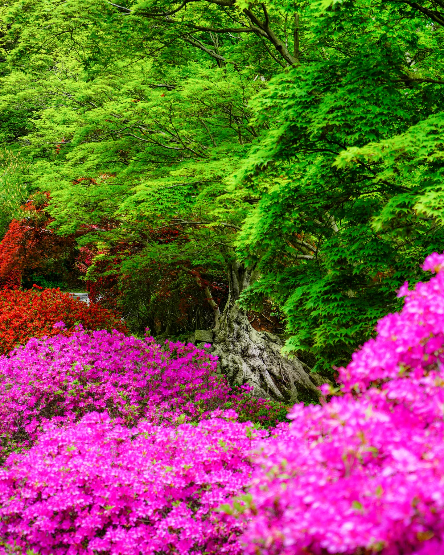 立派な根張りが物語る、庭園の主の様なカエデの大樹に寄り添うかのように画面を彩る色鮮やかなツツジたちがとても印象的な作品です。